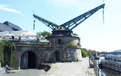 화물선에 물자를 적재하기 위한 용도로 1773년 지어진 기중기는 오늘날 옛 기중기(Alter Kranen)라는 이름으로 그 모습 그대로 보존되어 마인 강 강변에 놓여 있다. 뷔르츠부르크의 레지덴츠 궁전 등 바로크 건축의 대가로 인정받는 발타자르 노이만(Balthasar Neumann)의 아들인 프란츠 이그나츠 미카엘(Franz Ignaz Michael)이 만든 바로크 양식으로 만든 건물 자체도 그 외관의 장식이 볼만하고, 마인 강변에서 주변을 바라보는 경치도 그럴듯하다. 특히 알테마인교나 마리엔베르크 요새 등이 한 눈에 들어온다.