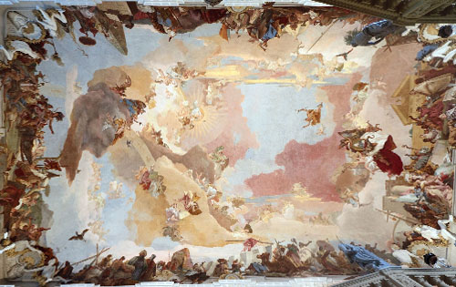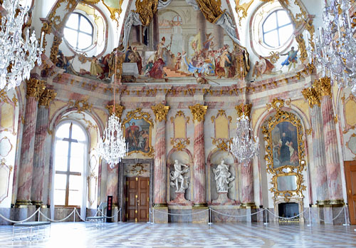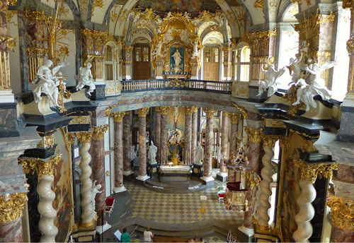 궁전 내부는 원래의 모습을 되살린 여러 방과 가구, 그리고 벽에 걸린 벽화들을 볼 수 있다. 뿐만 아니라 계단의 방의 프레스코화를 그린 이탈리아의 화가 티에폴로(Gibvanni Battista Tiepolo)의 걸작 프레스코화가 천장을 뒤덮은 황제의 방은 어느 궁전 부럽지 않은 화려함과 예술미를 보여준다.