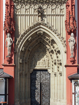 아치형 입구의 상단에 붙어있는 아담과 이브의 동상과 부조는 훗날 뷔르츠부르크의 시장까지 역임하게 되는 독일의 유명 조각가 틸만 리멘슈나이더(Tilman Riemenschneider)의 작품인데 현재 남은 것은 복사본이다. 진품은 마리엔베르크 요새의 박물관에 전시돼 있다. 리멘슈나이더는 훗날 권력싸움에 밀려나 재산을 몰수당하고 양손을 잘려 더이상 작품을 만들지 못하게 된다. 조그마한 내부 역시 전형적인 고딕 양식으로서 수준 높은 조각과 제단이 눈에 띈다.