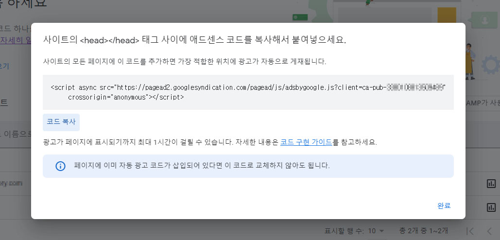 <script async src="https://pagead2.googlesyndication.com/pagead/js/adsbygoogle.js?client=ca-pub-코드번호(숫자)"crossorigin="anonymous"></script>