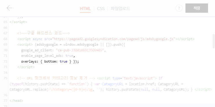 HTML 페이지에서 광고 스크립트 코드를 아래 코드와 같이 바꾸면 된다. '코드번호(숫자)' 부분은 각자 자기 코드번호로 변경해야 한다.
