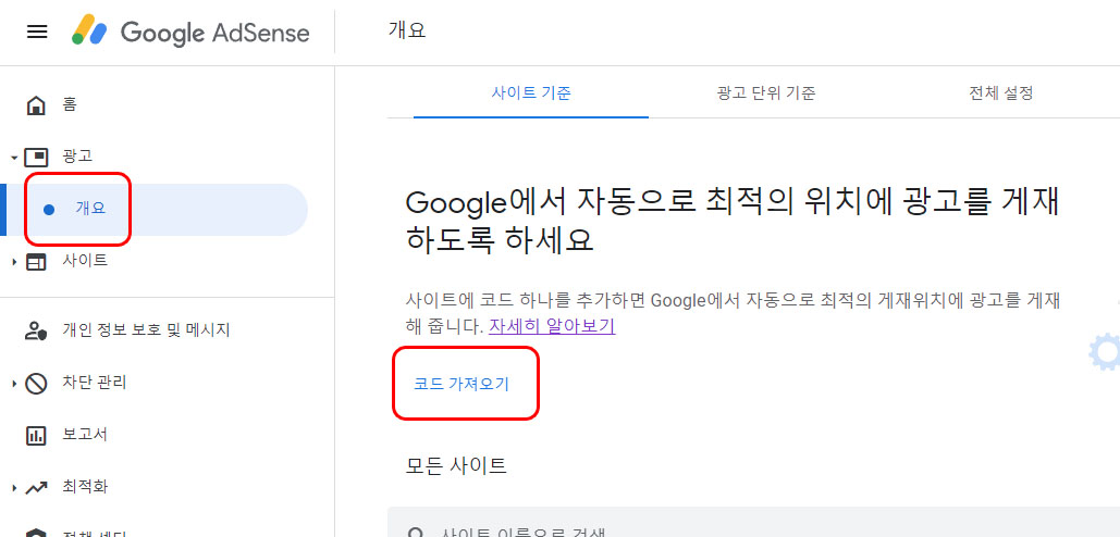 구글 애드센스에 접속해서 '광고 > 개요 > 코드 가져오기'를 클릭하면