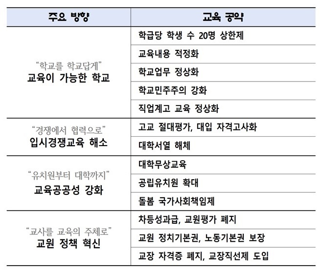 전국교직원노동조합(전교조)은 20대 대선을 앞두고 교육공약 요구안을 발표했다. 슬로건은 '차별과 불평등을 넘어 모두를 위한 교육으로'다. 전희영 전교조 위원장은 "모든 학생에게 평등한 배움의 권리를 보장하는 것은 우리 모두의 화두이자 대선 후보들의 화두가 되어야 한다"고 강조했다.
